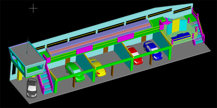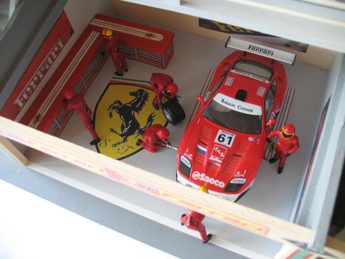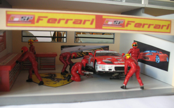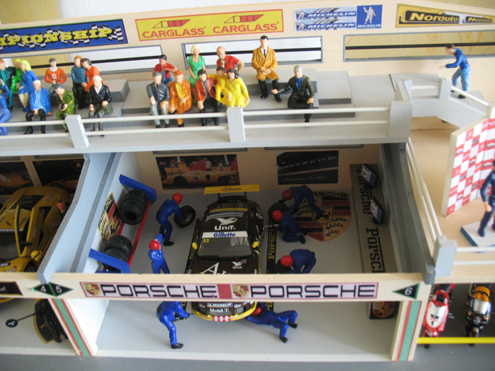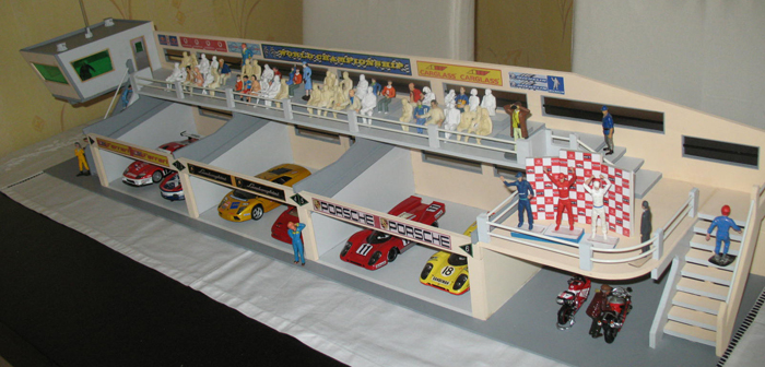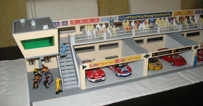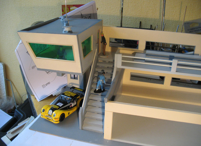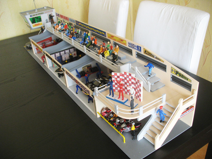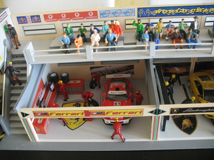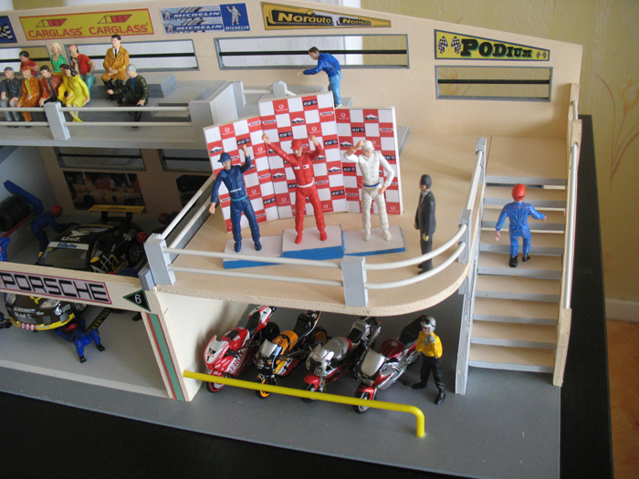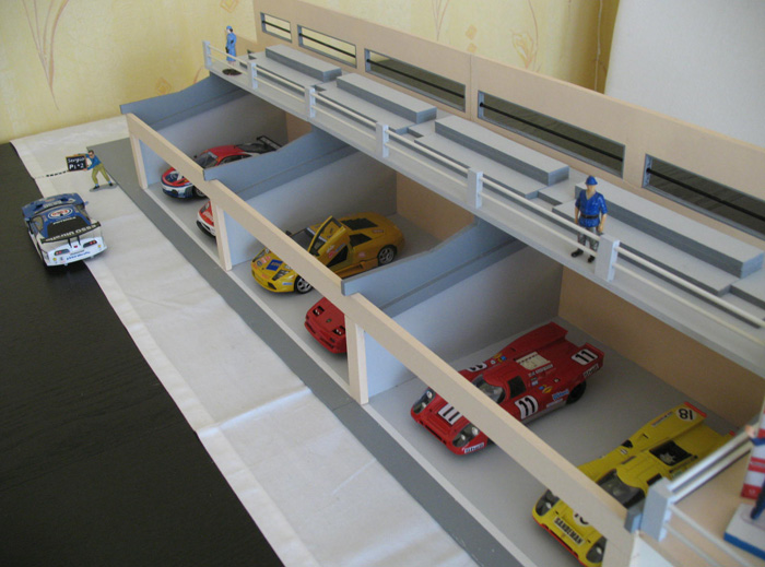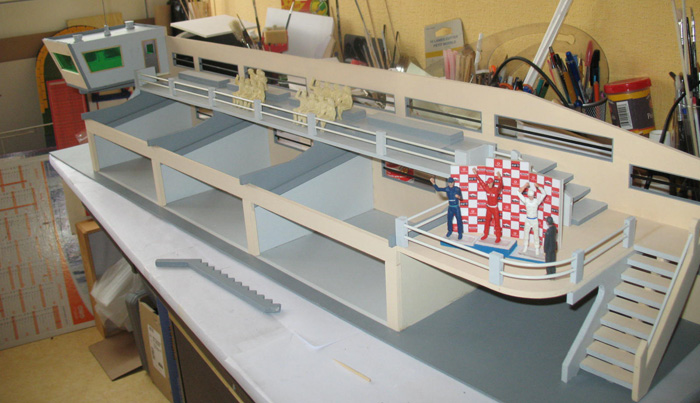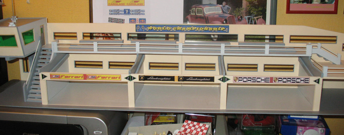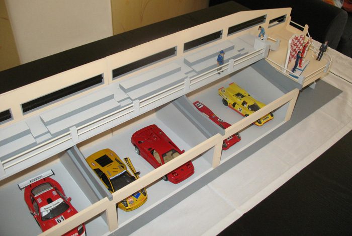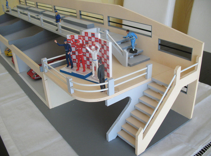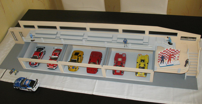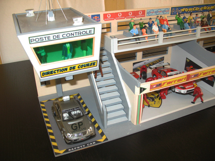 L'idée de départ est de faire des stands à ciel ouvert , mais protégés par des toits en plexiglas pour bien voir la décoration des boxes avec gradins, podium et poste de controle.